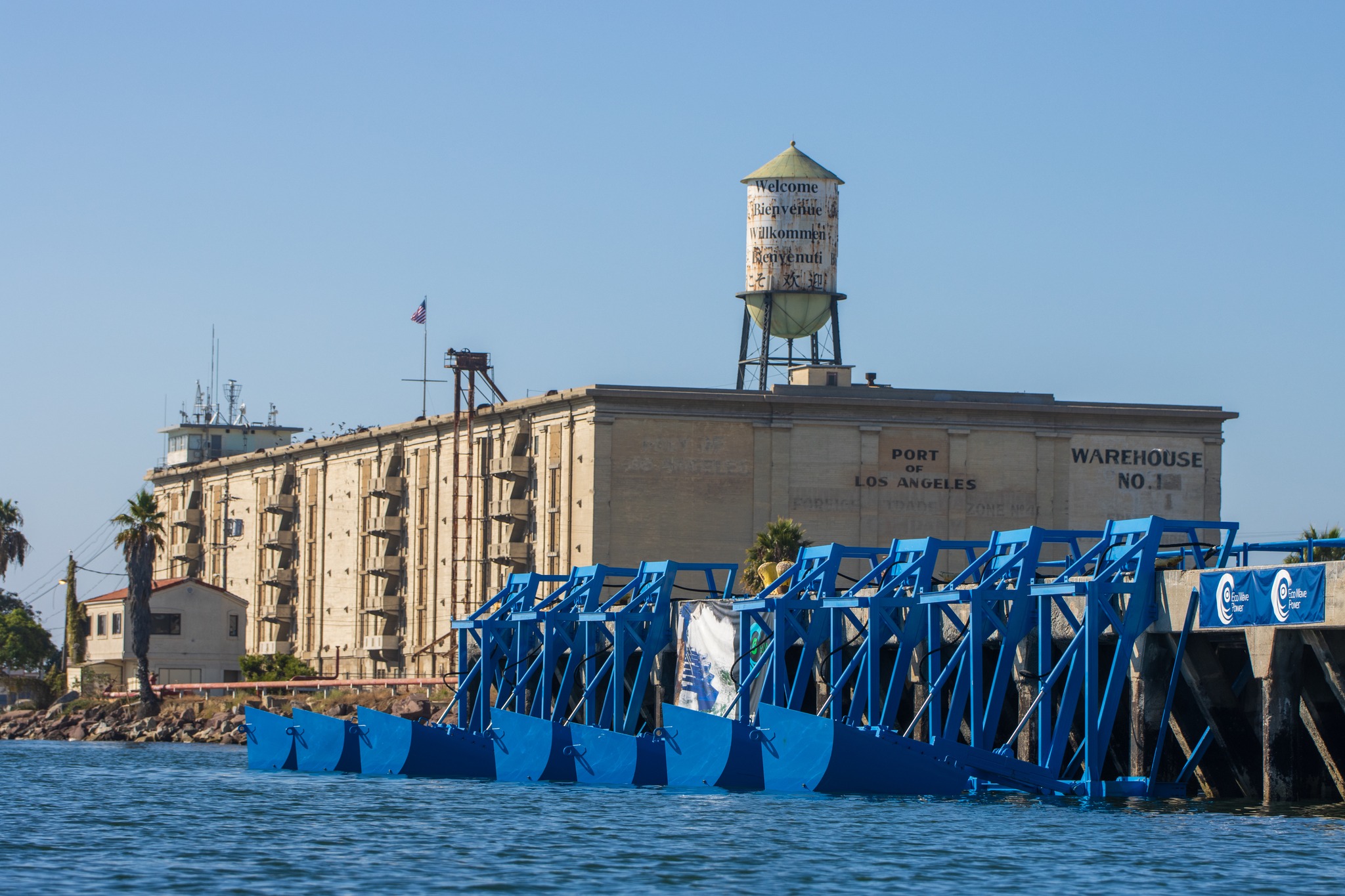 waves in the Port of Los Angeles. The technology is comprised of seven steel “floaters” that rise and fall with the motion of the waves, creating hydraulic pressure that drives a generator on land.
