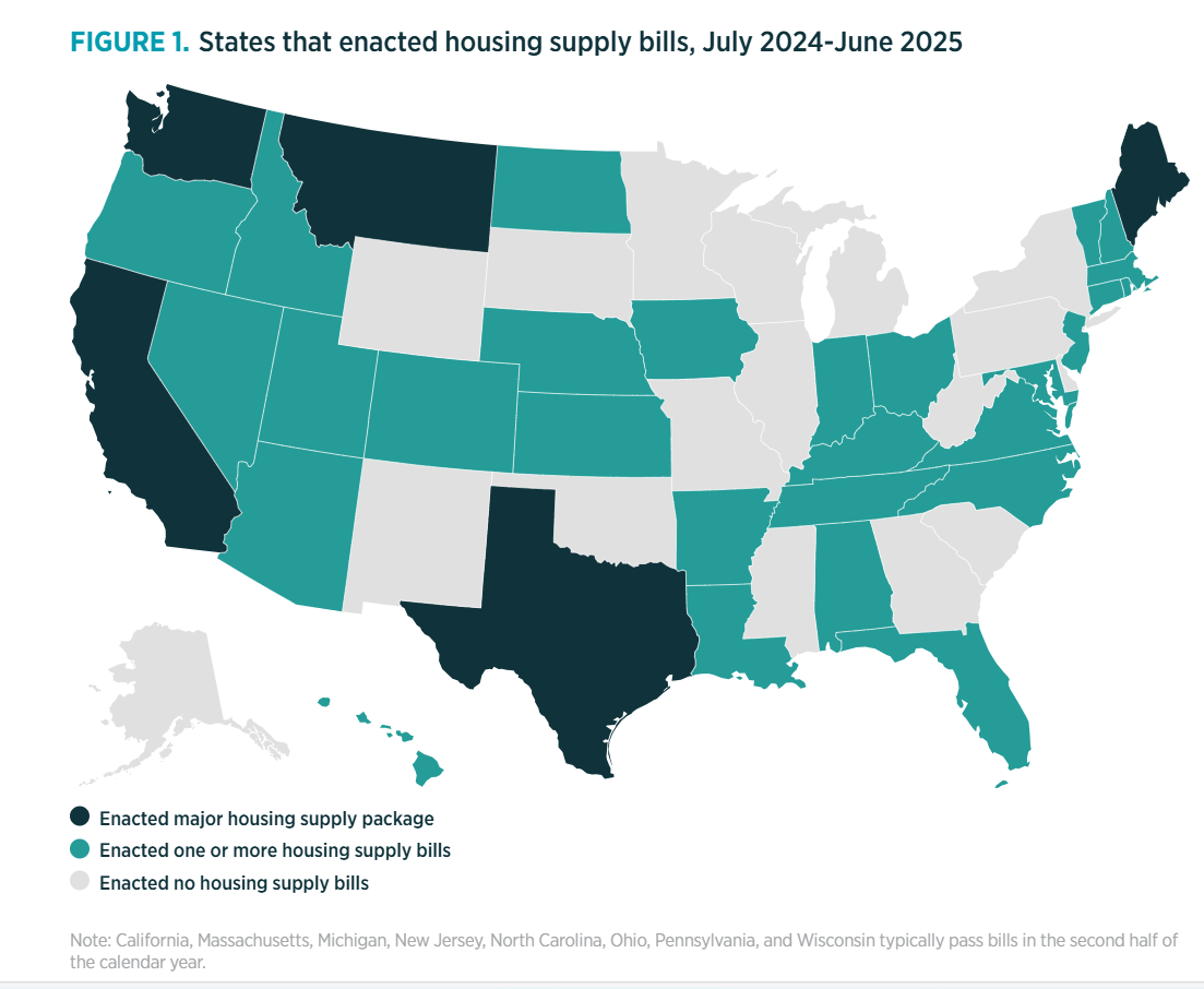 2025 has been a historic year for housing reform. A new policy brief from the Mercatus Center at George Mason University reported that 123 bills that streamline housing development were passed between July 2024 and June 2025 in state legislatures – more than tripling the previous year’s total.